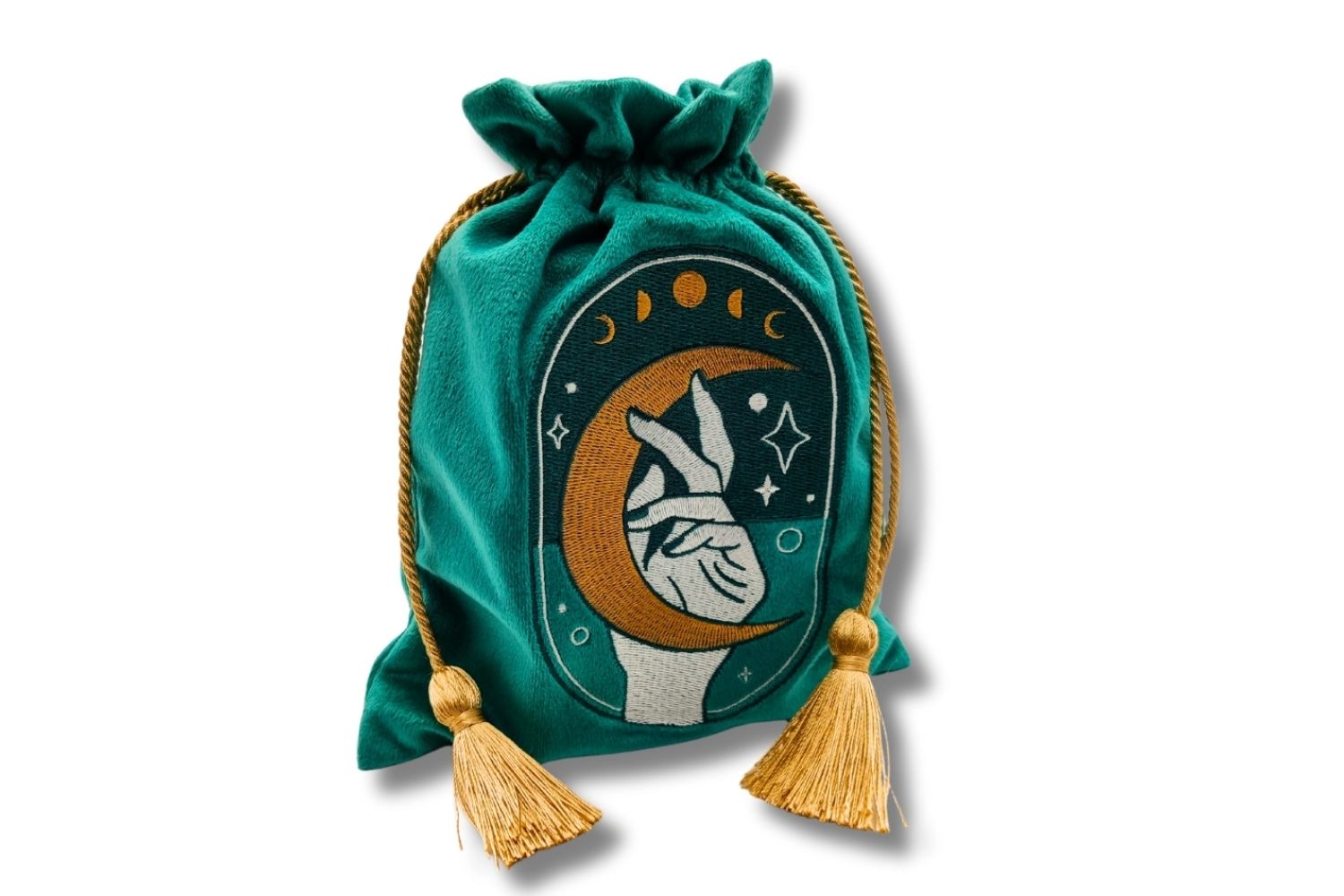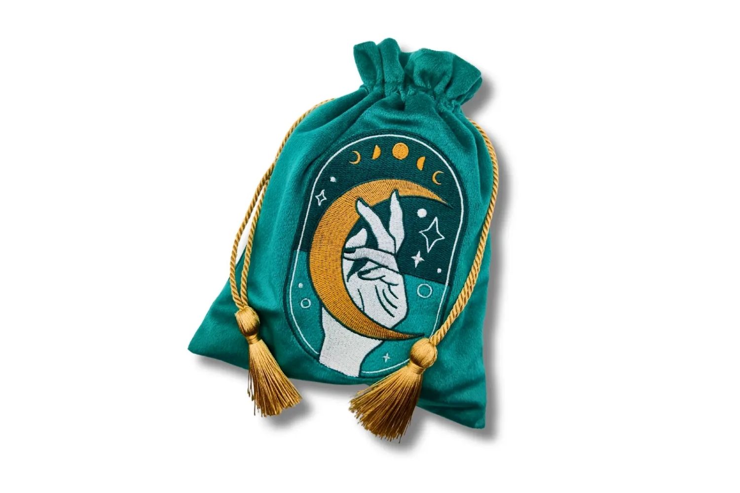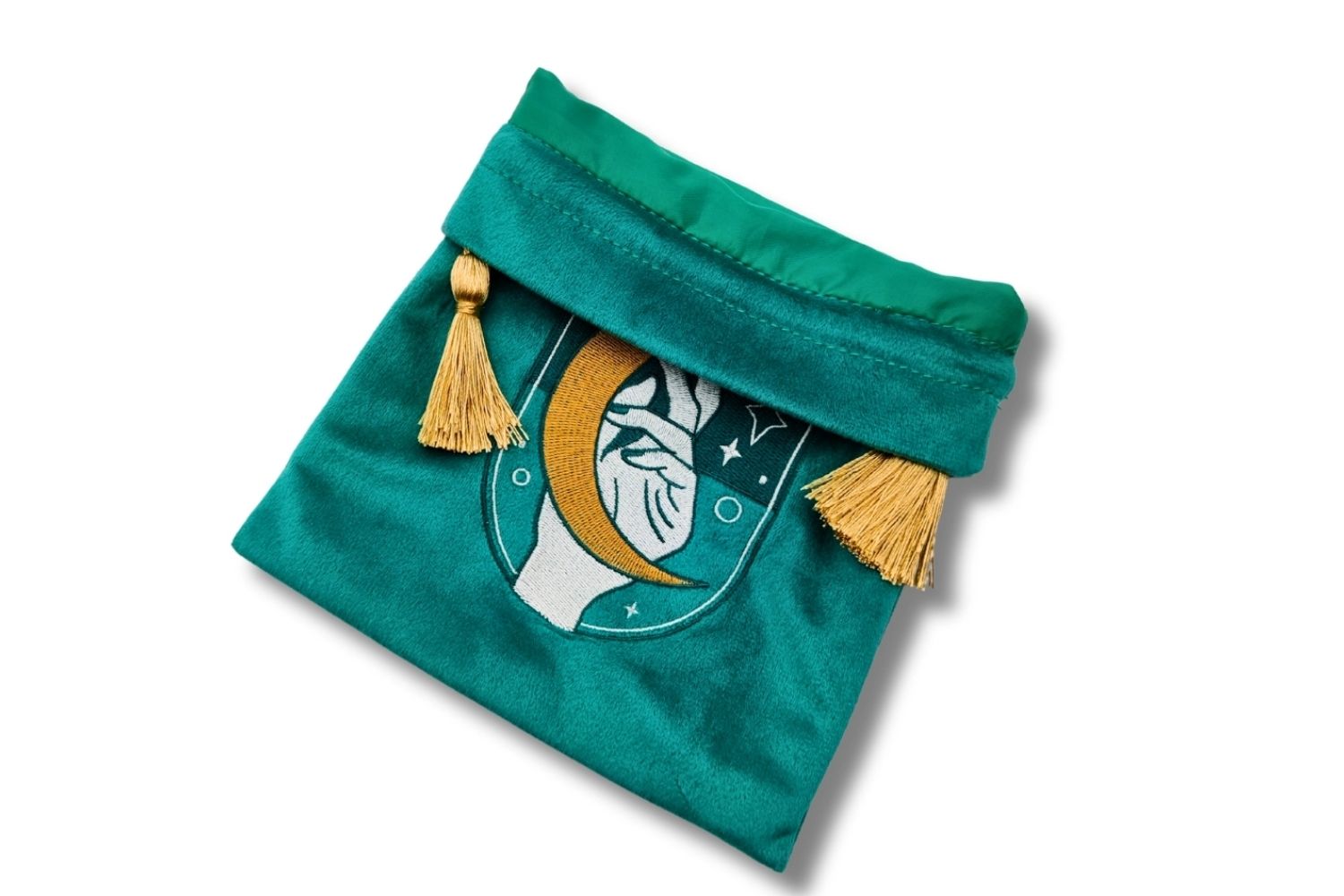 Protege e transporta os teus baralhos de tarot ou oráculo com elegância nesta luxuosa bolsa de veludo verde.