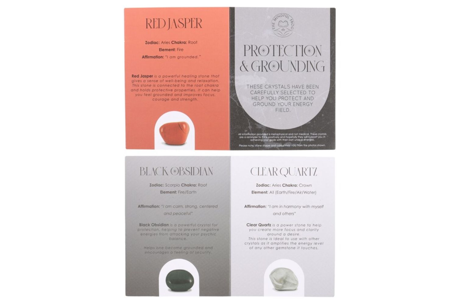 A obsidiana negra afasta energias negativas, o quartzo transparente promove clareza mental e concentração, e o jaspe vermelho favorece o relaxamento e o equilíbrio emocional.